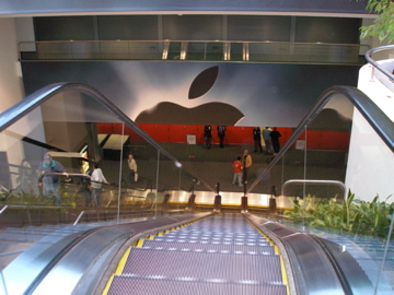 Thousands will descend elevators just like this tomorrow into the exhibit hall. As usual, there were plenty of guards in front of the exhibit halls today. Apple usually does its "last minute" booth construction and posters late in the evening when there are few people around to potentially spy a first at what will be announced tomorrow.