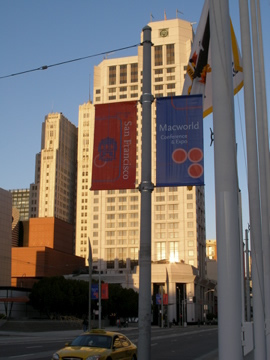 Around the Moscone Center complex poles hold San Francisco and Macworld Conference & Expo banners. The city is also visually busy with Apple advertising 360-kiosk banners and billboards. Tomorrow those current iPod ads will likely change over to whatever Apple announces.