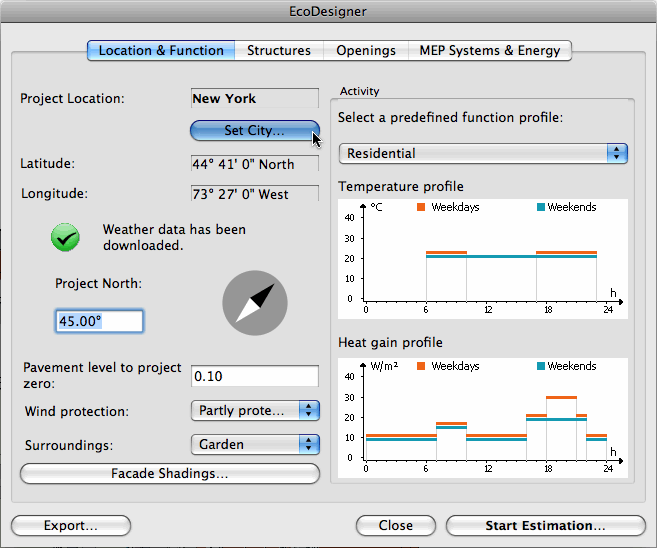 EcoDesigner comes loaded with all the essential energy data built into the common BIM assemblies from which you work in ArchiCAD. With EcoDesigner the architect works the same as before in ArchiCAD. From a set of palettes unique to EcoDesigner the architect sets the parameters that inform EcoDesigner of all aspects of the building in relation to energy use. For example, under the Location & Function tab (see image 02) you set your location in the world and the program downloads weather data for that location. You also set environmental parameters such as wind, facade shading, and site surroundings. And you set your building function. In the other tabs you set your structural envelope assemblies, openings, and input your MEP systems and energy data.