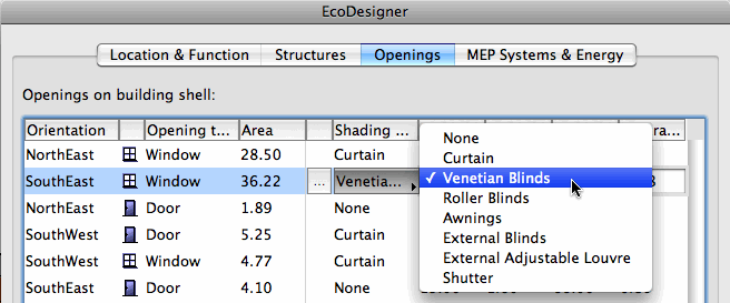 All of these settings are nicely laid out in the manner that is consistent with ArchiCAD’s interface standards. You can see from the Openings tab that windows and doors are pulled up from ArchiCAD’s common interface. The user can also specify if an opening has a shading type (see image 03).