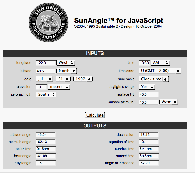 Used around the world since 1995, SunAngle Software is a premium shareware tool that calculates solar angles based on location, date and time, anywhere in the world. SunAngle runs directly in your web browser on your Mac or PC.