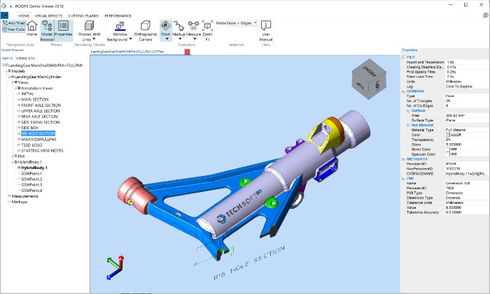 Finally, version 2016 shows integrations with HOOPS Exchange and HOOPS Publish, enabling Visualize users to leverage the capabilities of those two products, respectively, for exchanging data loads and for 3D PDF publishing. New sample operators allow developers to do exact measurements on CAD data via HOOPS Exchange. Another new component makes it easier for developers to build UI elements for assembly and/or model trees.