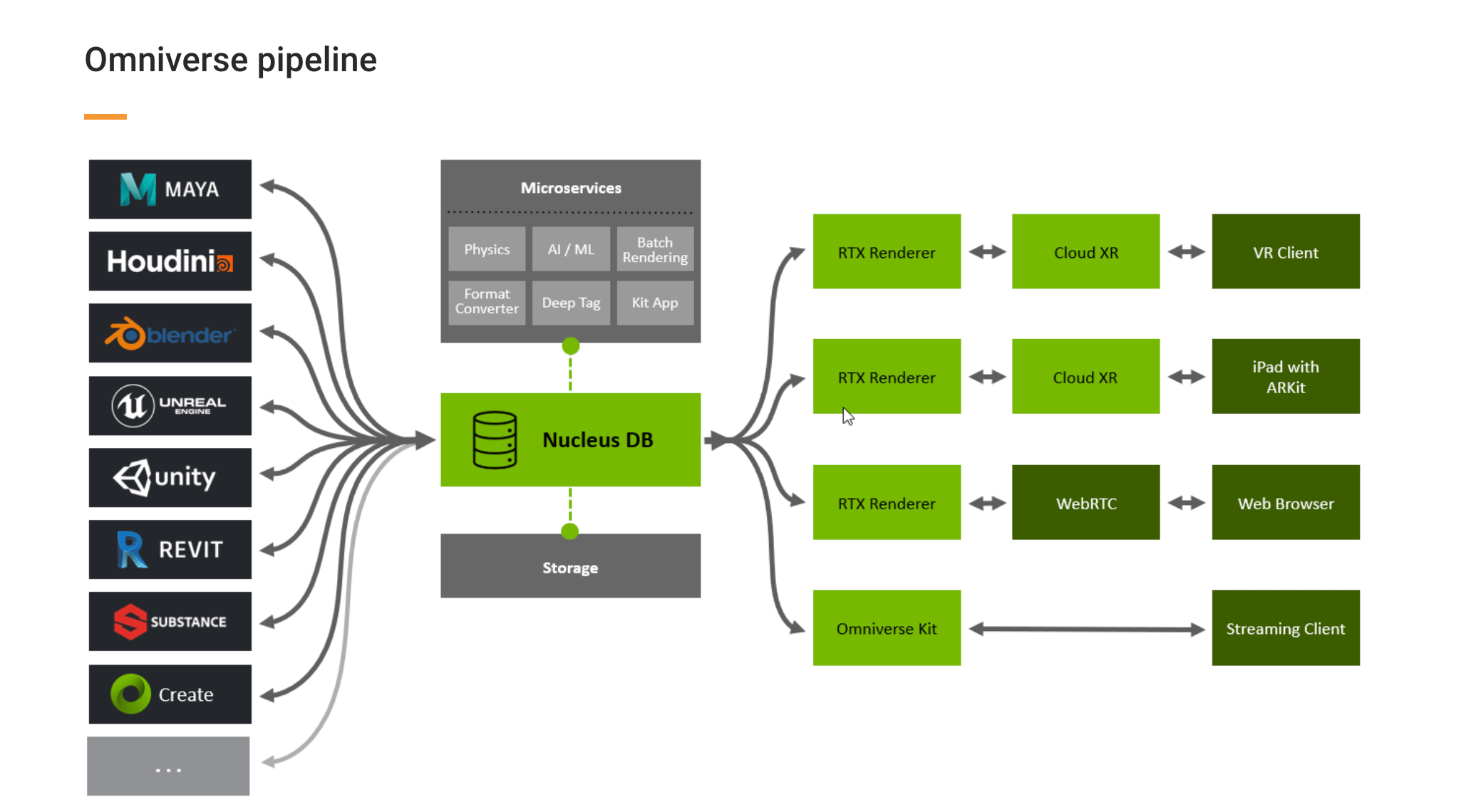 A chart showing the technical formation of the Omniverse platform as a technology pipeline for production. (click to enlarge)