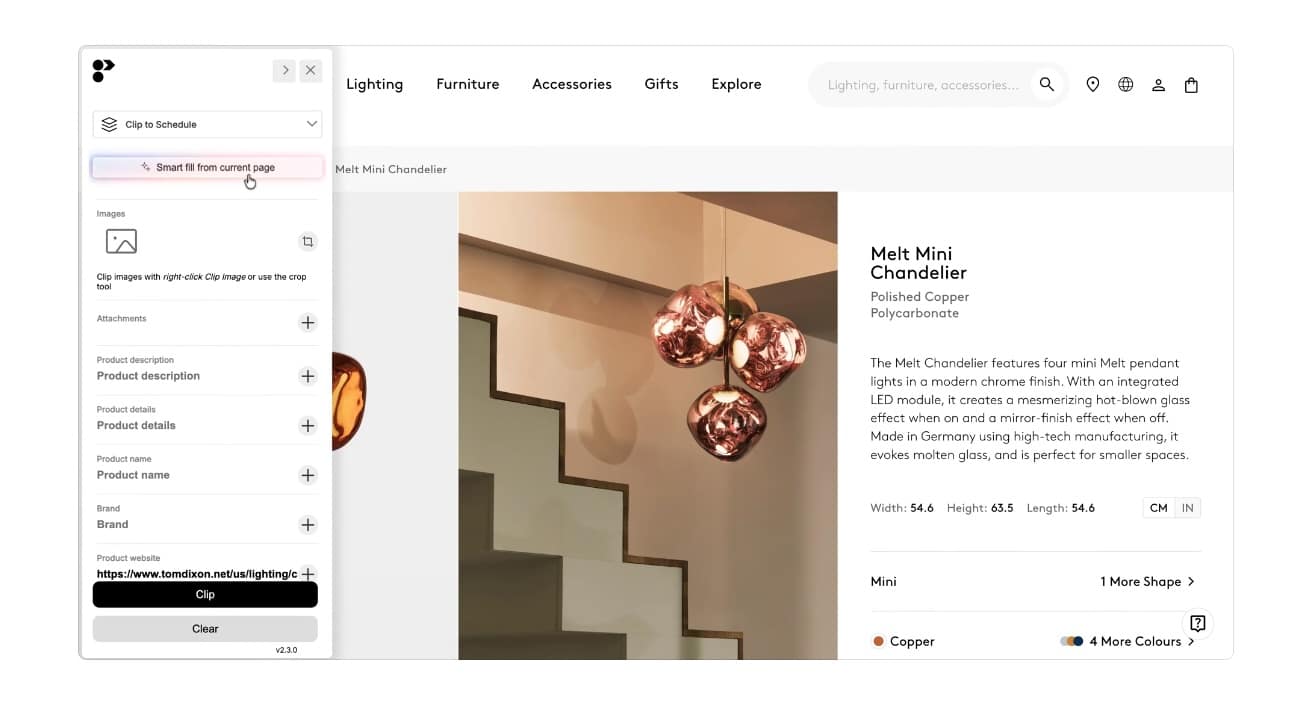 When you clip product data from a web page, Programa’s user interface asks you to select a project and then a schedule from a series of drop-down menus. The process appears remarkably seamless and streamlined, with a mixture of auto-generated/auto-assigned data fields and a very quick process of assigning data fields to specific data on the web page, and then it fills in automatically. The web clipper tool is truly impressive and wholly unique in the industry.